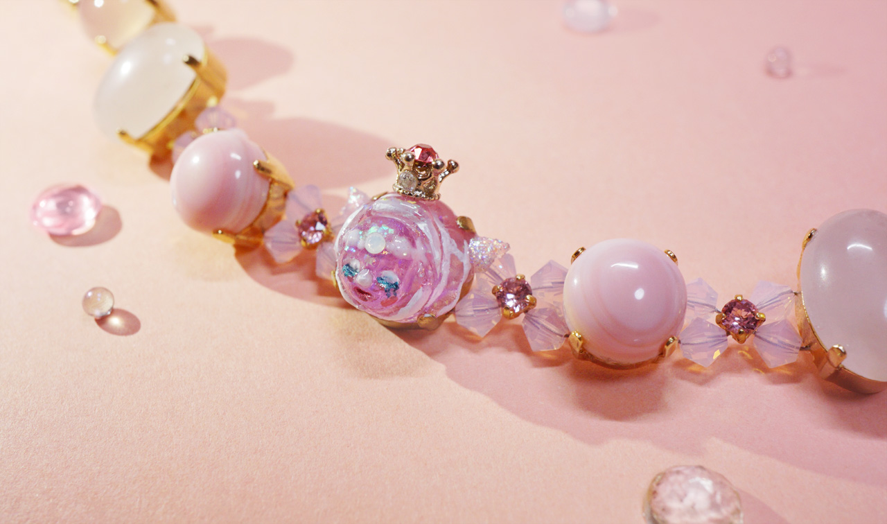 Atelier Starlightさんの【 ブレスレット 】のいちごミルクな天然石にうっとりしているのは…枠星屋の【 タビオトモ まぼろし庭園の妖精姫 】 まぼろし庭園の妖精姫 いち... -
